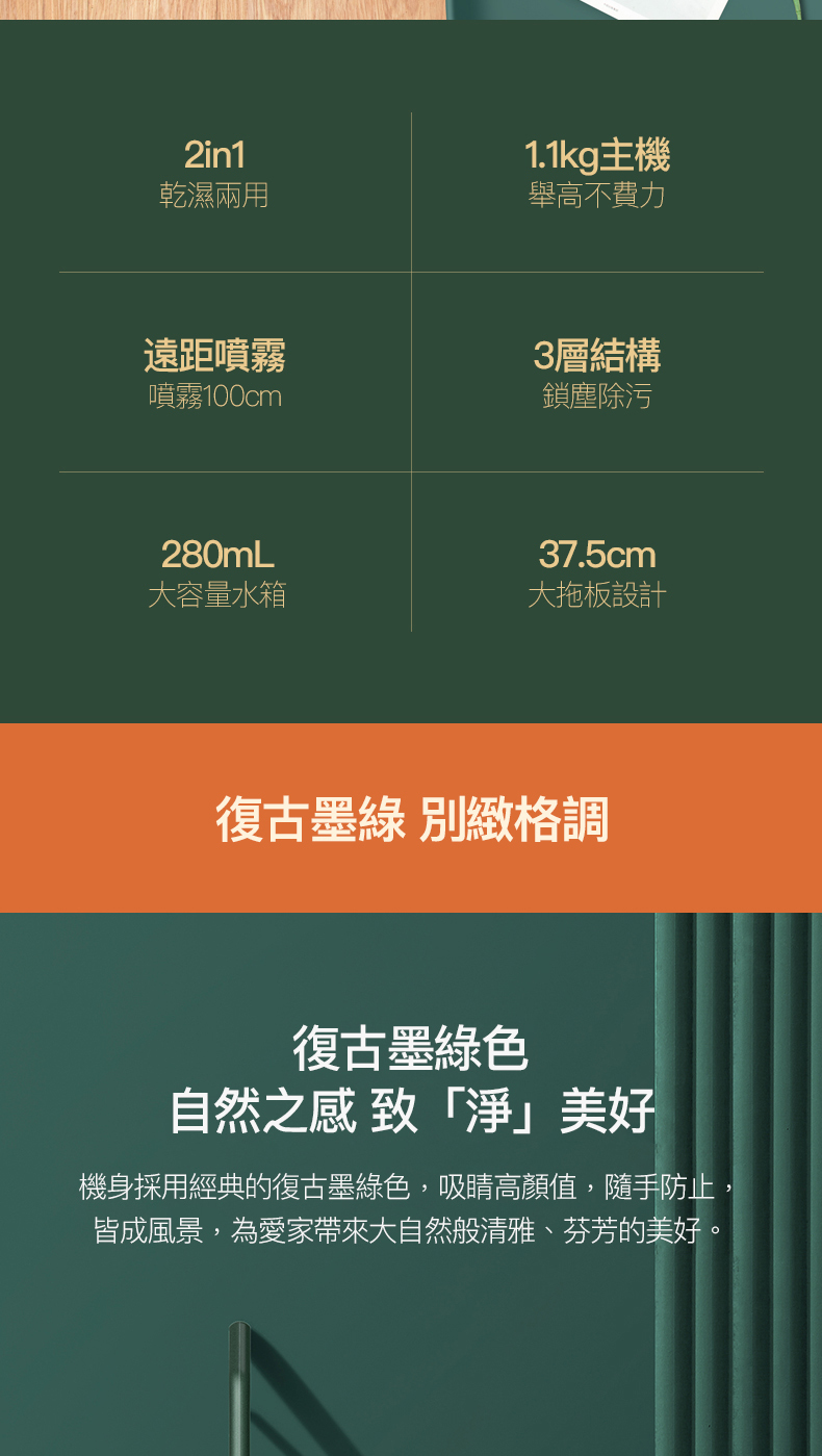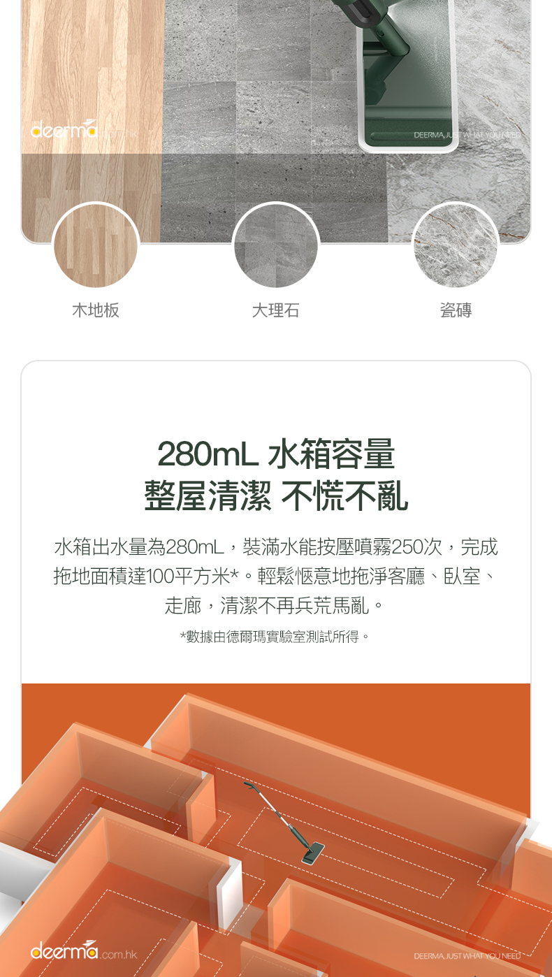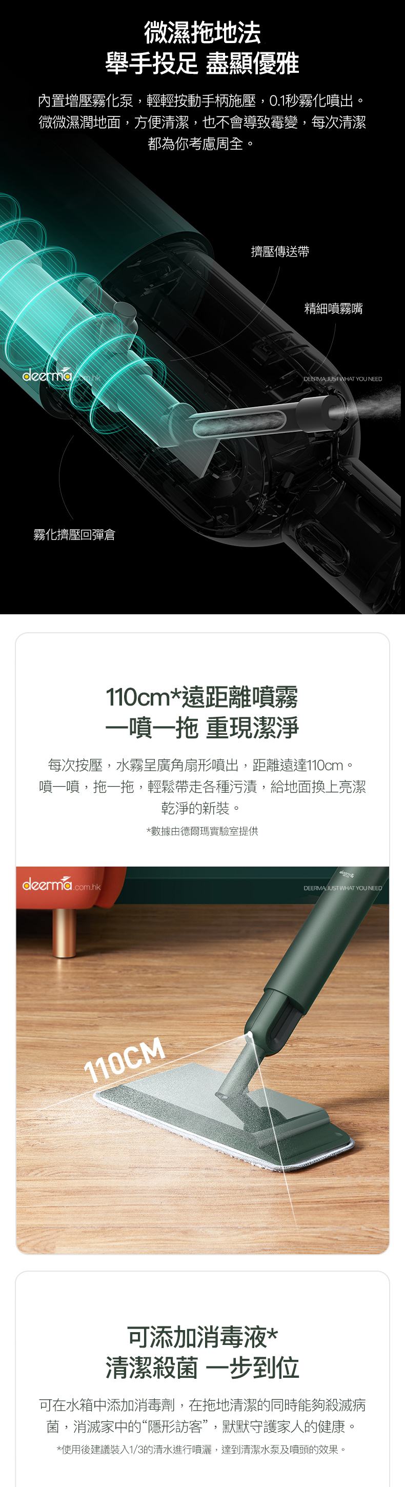 內置增壓霧化泵,0.1秒霧化噴出,距離遠達110cm。一噴一拖,輕鬆帶走污漬。