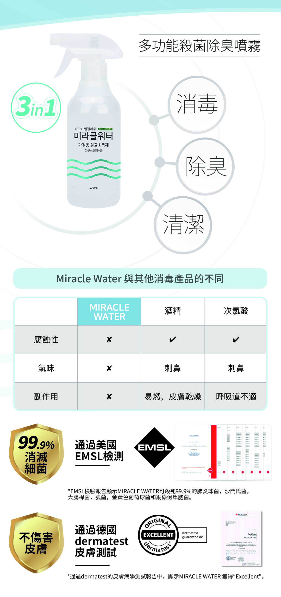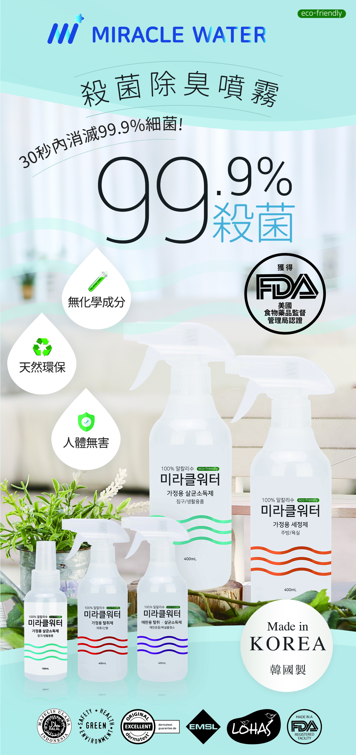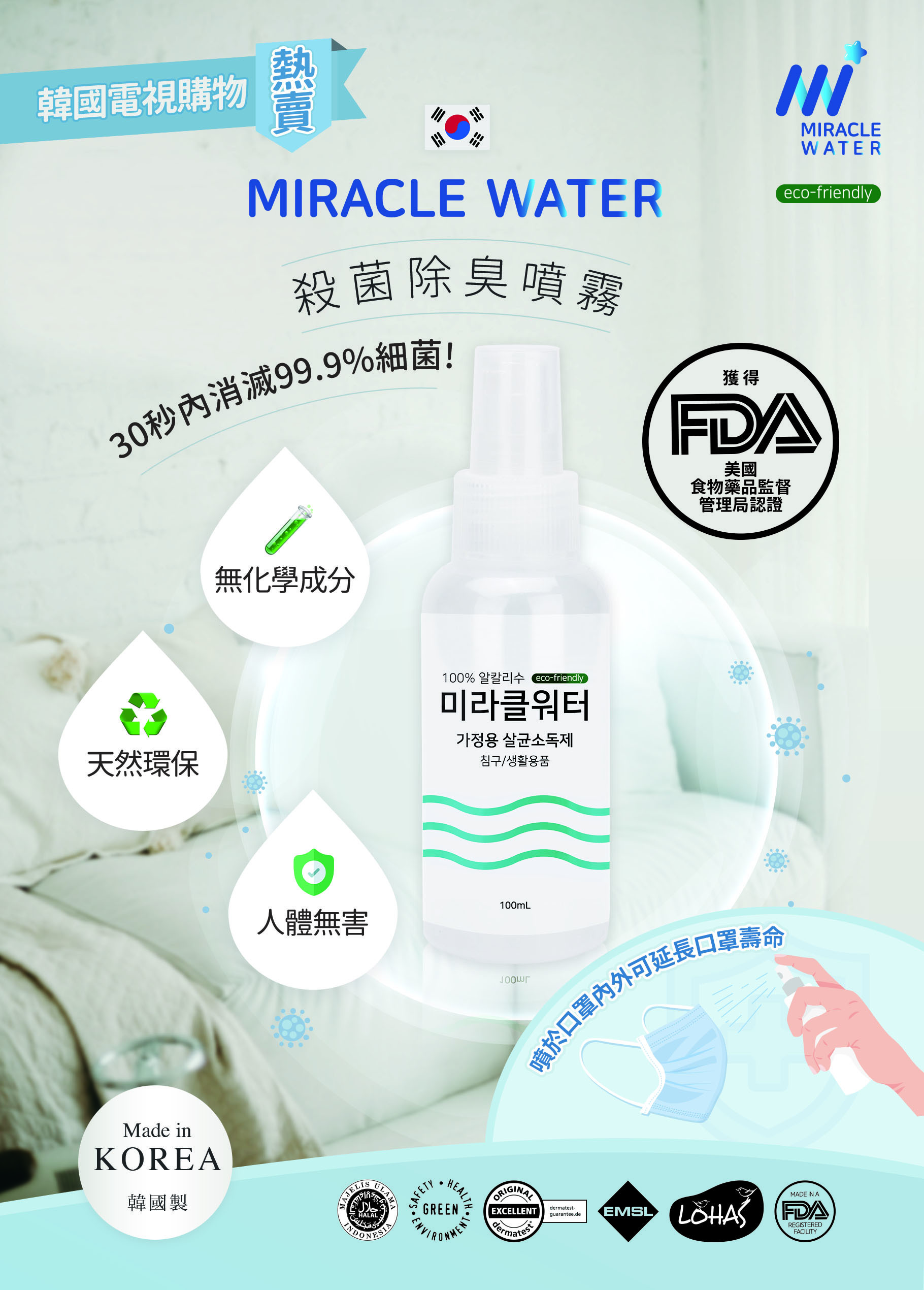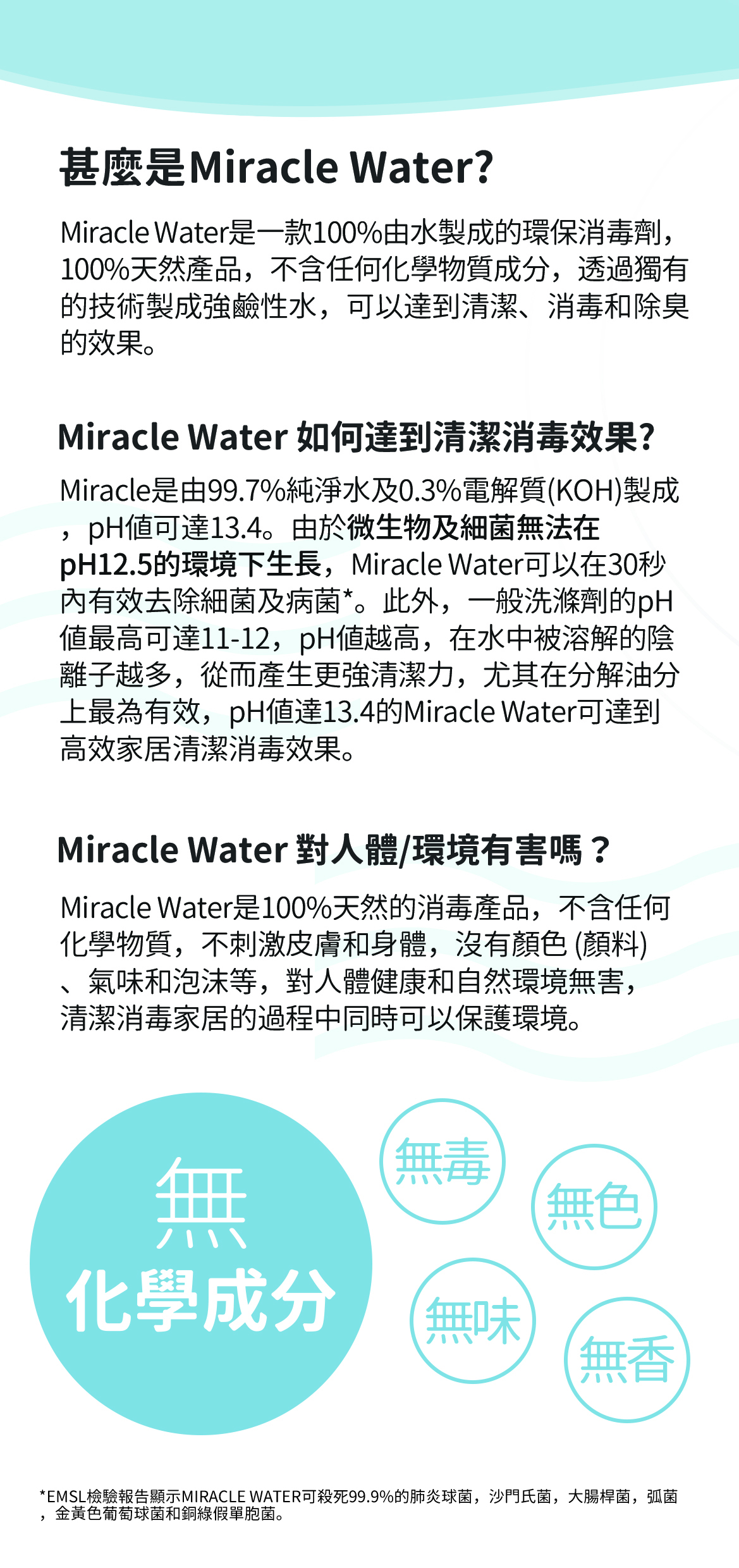 Miracle Water 強鹼電解水是由韓國Miracle Water 公司研發,使用電力分解自來水而形成。相較於市面上同類型產品,Miracle Water 強鹼電解所含有氫離子濃度更高,使其PH值達13.5 或更高。與一般的清潔劑不同,Miracle Water 強鹼電解水不含合成表面活性劑或化學物質,不對人體造成敏感,廣泛安全應用於清潔、消毒和除臭。同時,由於產品的主要成份是純水,使用期間亦不會對生態環境造成二次污染,適合不同的個人或家庭使用。