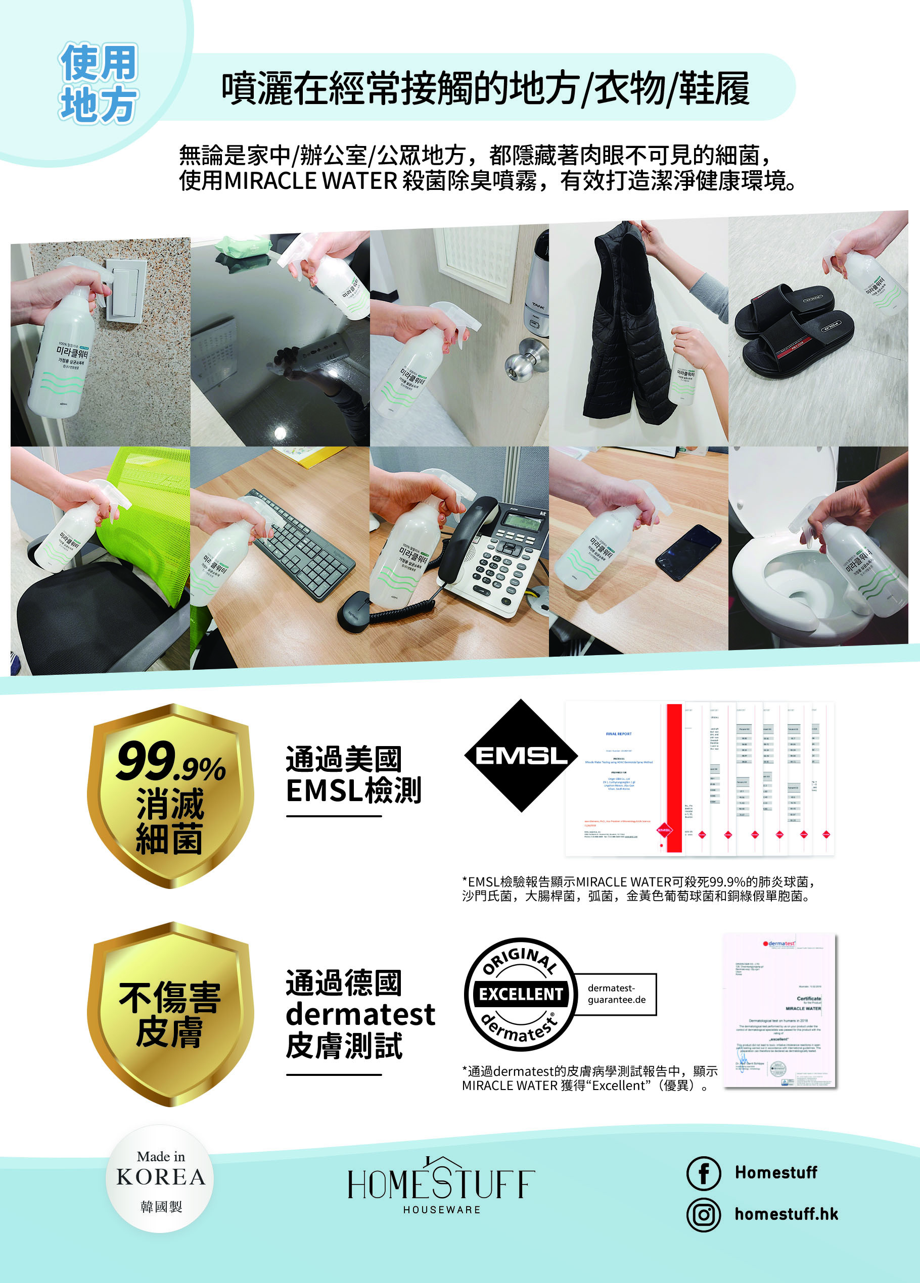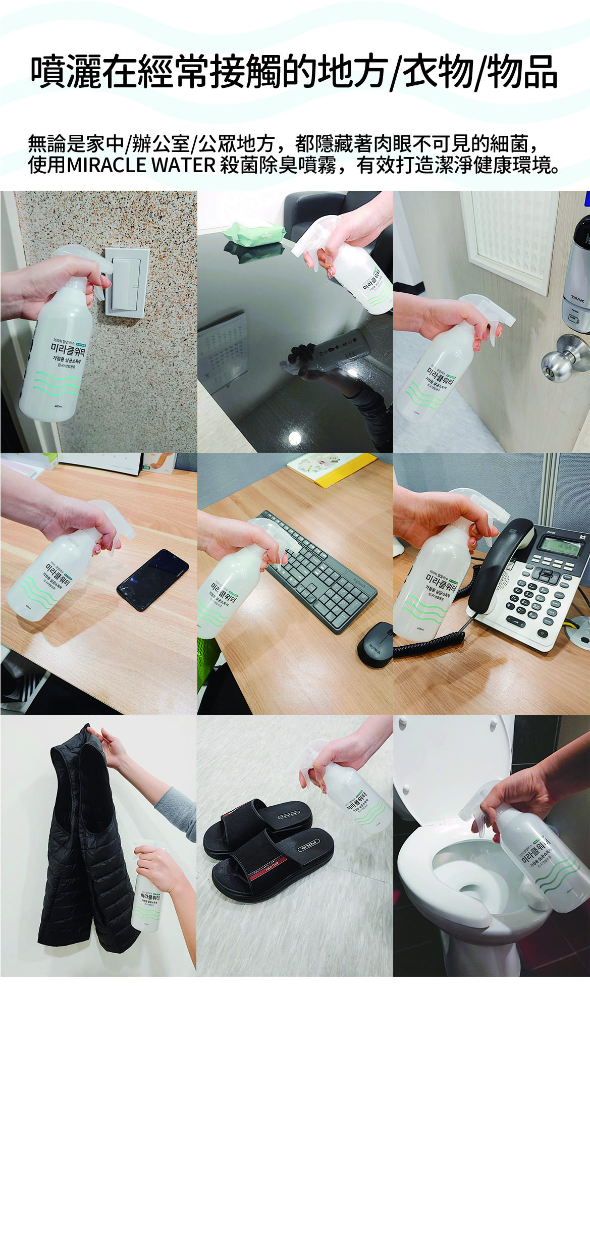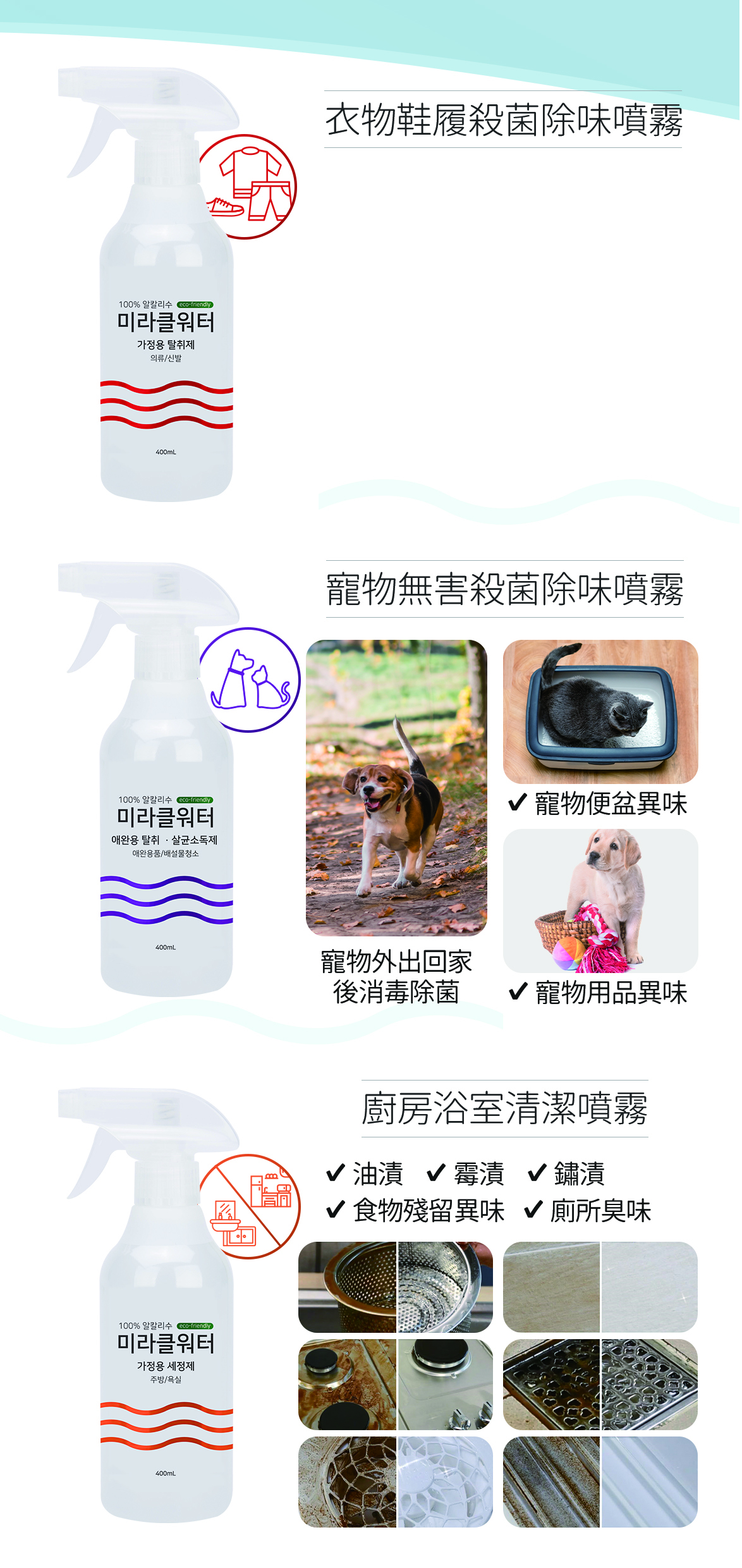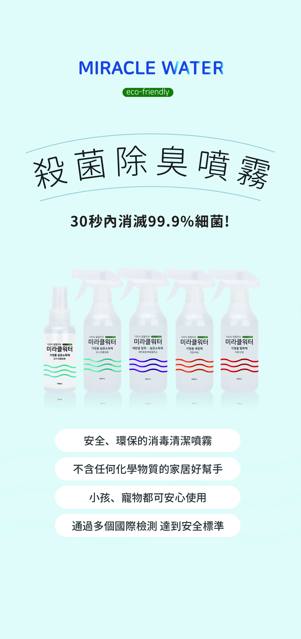 Miracle Water 強鹼電解水是由韓國Miracle Water 公司研發,使用電力分解自來水而形成。相較於市面上同類型產品,Miracle Water 強鹼電解所含有氫離子濃度更高,使其PH值達13.5 或更高。與一般的清潔劑不同,Miracle Water 強鹼電解水不含合成表面活性劑或化學物質,不對人體造成敏感,廣泛安全應用於清潔、消毒和除臭。同時,由於產品的主要成份是純水,使用期間亦不會對生態環境造成二次污染,適合不同的個人或家庭使用。